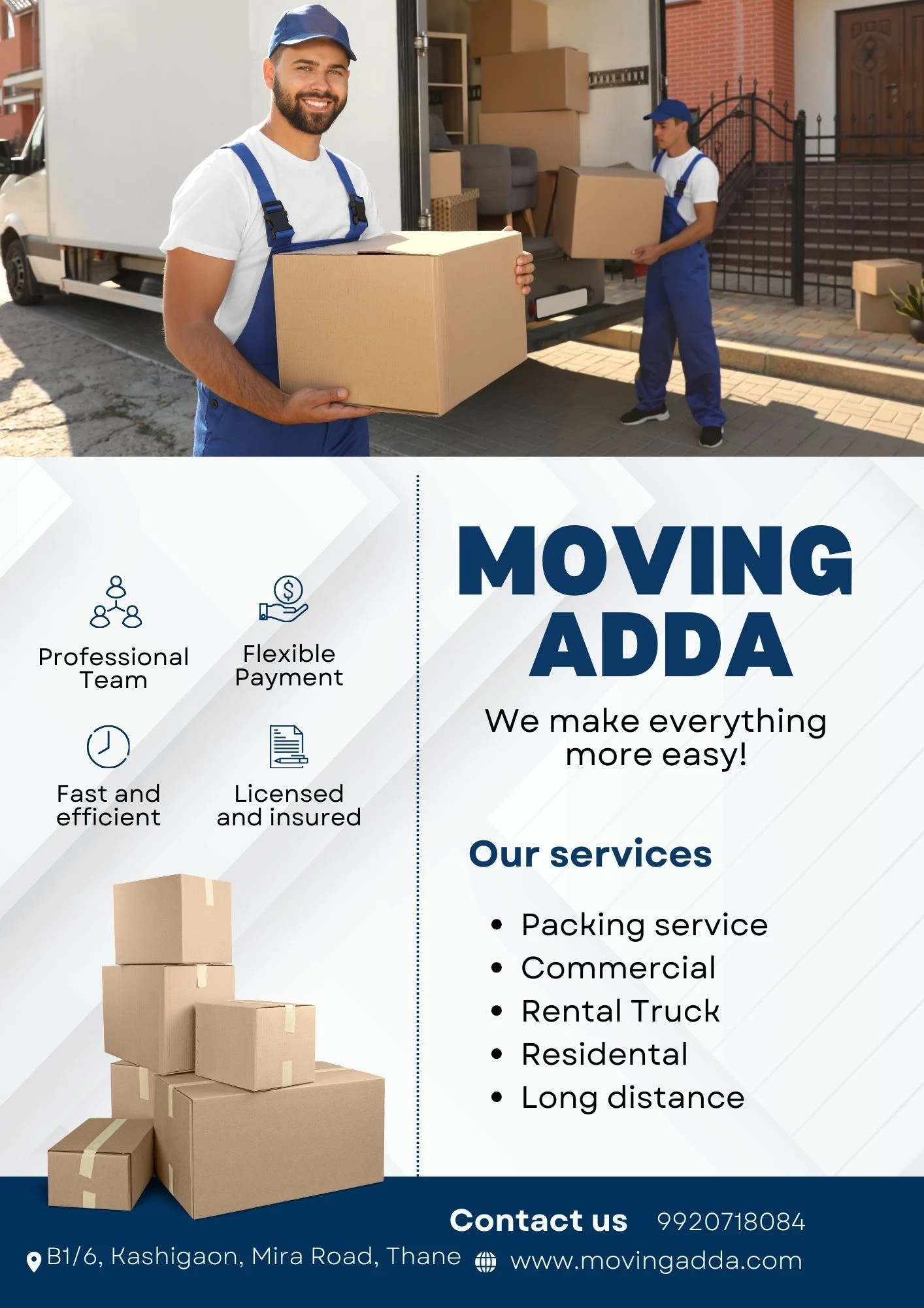 Moving Adda is your go-to solution for all your packing and moving needs in Mumbai, Navi Mumbai, Thane, and Mira Road. Whether you are relocating locally or over long distances, Moving Adda ensures a smooth and hassle-free moving experience.